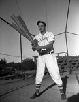 Chet Bethel, former Dallas, Texas, sandlot star, is now playing for the Willard Battery amateur baseball team. Bethel is standing in the middle of a baseball field, wearing his Willard Battery uniform and holding three baseball bats.