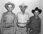 Arena officials at the fifth annual Coleman, Texas, rodeo were, left to right, George Wilderspin, of Fort Worth, Texas, George Beck, of Coleman, Texas, and Morris Cooper, of Midland, Texas. They are standing against a blank wall, all wearing cowboy hats. Mr. Wilderspin is wearing a solid-colored, long-sleeve shirt and trousers with a belt. Mr. Beck is wearing a striped, long-sleeve shirt and trousers with a belt. Mr. Cooper is wearing a striped, long-sleeve shirt and jeans.