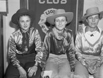 Cowgirls waiting for the opening parade at the 1940 Coleman, Texas, rodeo were, left to right, Margaret Owens, of Ozona, Texas, Mrs. Sam Windham, of Byrds, Texas, and Mrs. Deaman Burns, of Owens, Texas. They are sitting on a ledge, all wearing long-sleeve collared shirts, trousers and cowboy hats, and have bandannas tied around their necks.