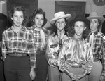 Cowgirls who attended the fifth annual Coleman, Texas, rodeo included, left to right, Faye Stone, of Pecan Springs, Texas, Raye Stone, of Talpa, Texas, Bessie Mae Rozelle, of Millersview, Texas, Jane Hawthorne, of Gouldbusk, Texas, and Mrs. Russell Allen, of Leaday, Texas. They are standing in front of a wall. Faye and Raye Stone are wearing matching plaid shirts and trousers. Raye is also wearing a bandanna around her neck. Miss Rozelle is wearing a long-sleeve, collared blouse, trousers and a cowboy hat. She has her arms around Miss Hawthorne's waist. Miss Hawthorne is wearing a long-sleeve, collared blouse, trousers and a cowboy hat. Mrs. Allen is wearing a plaid blouse, trousers and a cowboy hat.