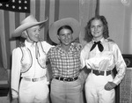 Cowgirls who attended the fifth annual Coleman, Texas, rodeo included, left to right, Curley Seale, of Baird, Texas, Patsy Morris, of Coleman, Texas, and Marjorie Beck, of Valeria, Texas. They are standing in front of a wall. Miss Seale is wearing long-sleeve shirt with embroidery details, trousers and a cowboy hat. Miss Morris is wearing a plaid shirt, trousers and a cowboy hat. Miss Beck is wearing a long-sleeve, collared shirt and trousers with a wide belt. Hanging on the back wall is an American flag.