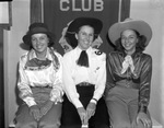 Cowgirls who attended the fifth annual Coleman, Texas, rodeo included, left to right, Pauline Goddard, of Brownwood, Texas, Vivian Ellis, of San Saba, Texas, and Billie Marie Miller, of Coleman, Texas, Miss Miller was queen of the 1940 Coleman Rodeo. They are sitting on a ledge. On the back wall is a Lions Club banner. Miss Goddard is wearing a long-sleeve, collared blouse, a hat and trousers, and has a bandanna tied around her neck. Miss Ellis is wearing a long-sleeve shirt, dark-colored trousers and a cowboy hat. Miss Miller is wearing a long-sleeve, collared shirt, trousers and a cowboy hat.