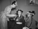 Enjoying a tea party during the Jack County historical celebration at Jacksboro, Texas, were, left to right, Mrs. Bill Breech, standing, Mrs. M. A. Culwell, 76, of Poolville, Texas, and Mrs. A. J. Garner, 76, who has lived her entire life in Jack County, Texas. Mrs. Culwell and Mrs. Garner are seated. Mrs. Breech is wearing a long-sleeve dress and a hat and is pouring Mrs. Culwell a glass of tea. Mrs. Culwell is wearing a long-sleeve, polka-dot dress, a hat and eyeglasses. Mrs. Garner is wearing a long-sleeve, floral print dress, a hat and eyeglasses.