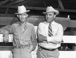 Appraising the quarter horses at the Texas Cowboy Reunion at Stamford, Texas, were Bob Denhardt, left, of Texas Agricultural and Mechanical College, secretary of the American Quarter Horse Association, whose stallion, Del Rio Joe, was the blue ribbon winner of the show, and W. B. Warren, of Hockley, Texas, president of the association. Both men are wearing long-sleeve button-down shirts, trousers and cowboy hats. Warren is wearing a necktie.