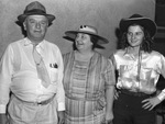 Attending the Texas Cowboy Reunion at Stamford, Texas, were, left to right, Mr. and Mrs. F. W. Davis, of Fort Worth, Texas, and Miss Betty Lou Driskill, of Cresson, Texas. They are standing in front of a blank wall. Mr. Davis is wearing a long-sleeve shirt, a necktie, pinstripe trousers and a hat. Mrs. Davis is wearing a striped dress and a wide-brimmed hat. Miss Driskill is wearing a long-sleeve collared blouse, trousers and a cowboy hat.