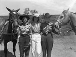 Attending the Texas Cowboy Reunion at Stamford, Texas, were, left to right, Margaret Owens, Mary Nell Edwards, of Big Spring, Texas, and Thena Mae Farr, of Seymour, Texas. They are standing outside, and there is a horse to the left and to the right of them. Miss Owens is wearing a long-sleeve blouse, trousers and a cowboy hat. Miss Edwards is wearing a striped blouse, trousers and a cowboy hat. Miss Farr is wearing a long-sleeve blouse, a necktie, trousers and a cowboy hat.
