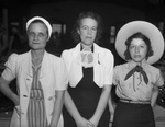 Manning the registration booth at the Texas Cowboy Reunion at Stamford, Texas, were, left to right, Irene Williamson, of Anson, Texas, Mae Weldon, of Stamford, Texas, and Ethel Irby, of Haskell, Texas. Miss Williamson is wearing a striped dress, a coat and a hair scarf. Miss Weldon is wearing a dress and a blazer. Miss Irby is wearing a short-sleeve blouse, a skirt and a cowboy hat.