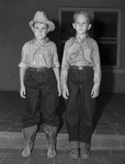 In attendance at the Texas Cowboy Reunion at Stamford, Texas, were Dick Waddell, left, and his cousin, Richard T. Waddell Junior, both of Kermit, Texas. The young boys are both wearing collared, button-down shirts, jeans and cowboy boots. Dick is wearing a cowboy hat. The sleeves of his shirt are rolled up and his pant legs are cuffed to reveal the designs on his boots.