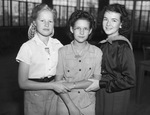 In attendance at the Texas Cowboy Reunion at Stamford, Texas, were, left to right, Wynona Rush, of Stamford, Texas, Margaret Griggs, of Stamford, Texas, and Velma Fay Harris, of Dallas, Texas. Wynona and Margaret are holding hands. Wynona is wearing a short-sleeve collared blouse, a skirt and a belt. She has a brooch pinned to her blouse. Margaret is wearing a short-sleeve collared blouse, a skirt, eyeglasses, a necklace and a bracelet on her left wrist. Velma is wearing a long-sleeve blouse, a bandanna around her neck and a skirt.