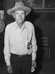 In attendance at the 11th annual Texas Cowboy Reunion at Stamford, Texas, was John Humphrey, of Aspermont, Texas. He is wearing a long-sleeve, button-down shirt, trousers and a cowboy hat. He is holding a pack of Camel brand cigarettes in his left hand.