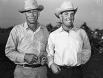 In attendance at the 11th annual Texas Cowboy Reunion at Stamford, Texas, were J. H. Wharton, left, of Dumont, Texas, and his son, Allen Wharton. They are standing outdoors. Both men are wearing long-sleeve, button-down shirts, trousers, belts and cowboy hats. J. H. is holding a cigarette in his left hand.