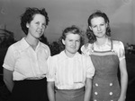 In attendance at the 11th annual Texas Cowboy Reunion at Stamford, Texas, were, left to right, Misses Margaret Fulton, of Paducah, Texas, Geneva Smith and Gladys Thompson, both of Dumont, Texas. They are standing outdoors. Miss Fulton and Miss Smith are wearing short-sleeve, collared blouses and skirts. Miss Thompson is wearing a short-sleeve, collared blouse and a pinafore dress.