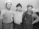 Attending the 11th annual Texas Cowboy Reunion at Stamford, Texas, were, left to right, Lee Lucas, of Throckmorton, Texas, J. C. Powell, of Spur, Texas, and Veto Austin, also from Spur, Texas. They are standing outdoors. Mr. Lucas and Mr. Powell are wearing long-sleeve, button-down shirts, trousers and cowboy hats. Mr. Austin is wearing a long-sleeve, button-down shirt, overalls and a cowboy hat.