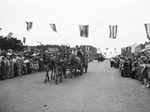 The 6666 Ranch chuck wagon shown in the parade at the Texas Cowboy Reunion at Stamford, Texas. The wagon is being pulled by four mules. Four men are riding in the wagon. Spectators are standing on either side of the road, watching the parade.