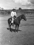 J. L. Byrd, of Post, Texas, manager of the O. S. Ranch, shown at the Texas Cowboy Reunion at Stamford, Texas. He is riding a horse. He is wearing a long-sleeve, collared shirt, trousers and a cowboy hat.