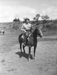 George Brown, of Woodson, Texas, shown on his roping horse, "Dollie," at the Texas Cowboy Reunion at Stamford, Texas. He is wearing a long-sleeve, collared shirt, trousers and a cowboy hat. Two other horses are in the background, sans riders.
