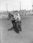 Charles Albright and Miss Eilah Blan Elliott exhibit the quarter horse champion, "Del Rio Joe," at the Texas Cowboy Reunion at Stamford, Texas. Albright is wearing a long-sleeve shirt, trousers and a cowboy hat. Miss Elliot is wearing a long-sleeve blouse, a bandanna, trousers and a cowboy hat. Two medals are pinned to the horse's bridle.