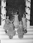 Taking part in the De Leon, Texas, Peach and Melon Festival were, left to right, back row: Jay Nowlin, Barbara Bell and Irma Lee Holdridge; front row, Barbara Schuman and Nina Locke. The young girls are all wearing dresses with ruffle details. Jay, Barbara Schuman and Nina are wearing identical dresses and Barbara Bell and Irma are also wearing matching dresses. Barbara Schuman and Nina are holding baskets filled with flowers.