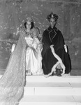 Zannette Stephenson (left) and Dale Cook were crowned queen and king of the De Leon, Texas, Peach and Melon Festival. They presided over the festival's social activities. They are seated at their thrones. Miss Stephenson is wearing a floor-length gown, a crown and a cape with a long train. Mr. Cook is wearing a fur-trimmed cloak and a crown.