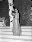 Helen Insall was a runner-up for queen of the Peach and Melon Festival at De Leon, Texas. She is standing next to a pillar, wearing a floor-length dress with lace details on the bodice. She has her right arm in the air and is wearing a watch on her left wrist.