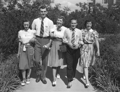College students from all over Texas are attending the third annual pre-school conference of the Baptist Student Union of Texas. Walking through the Southwestern Baptist Theological Seminary left to right are, Miss Mildred Cariker, Ed Smith, Miss Hazel Perkison, Dexter Riddle, and Louise Johnson. Miss Mildred Cariker of Nacogdoches, Texas attends Stephen F. Austin State Teachers College. She is wearing a frilly blouse and a polka-dot skirt. Mr. Smith of Marshall, Texas is a student at Texas A&M. He is dressed in button-up shirt with cuffed sleeves, a necktie, and trousers. Miss Perkison of Stamps, Arkansas, is enrolled in the seminary. She is wearing a collared blouse with a gingham skirt. Mr. Riddle of Abilene, Texas, is a 1940 graduate of Hardin-Simons University. He is dressed in a checkered shirt, necktie, and striped trousers. Miss Johnson of Dallas, Texas, is a student at Southern Methodist University. She is wearing a patterned dress.