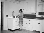 Mrs. J. H. Mangham, shown in her red and white all-electric kitchen. She is stirring a pot of soup on the stove. Mrs. Mangham is wearing a dress with a solid-colored bodice and patterned skirt.