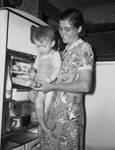 Mrs. Herman Cole, of Saginaw, Texas, holds two-year-old Sonny in her arms as she pulls a tray of chocolate ice cream out of the refrigerator. The young boy is spooning out a bit of the ice cream. He is wearing striped overalls. Mrs. Cole is wearing a dress and eyeglasses.