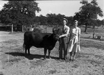 Mr. and Mrs. T. D. Williams, of Jacksboro, Texas, shown with an Aberdeen-Angus heifer from their ranch. They are members of the Texas Aberdeen-Angus Breeders Association. They took some of their cattle to the Gowdy ranch 15 miles north of Jacksboro for a field day so other members could see their cattle. Mr. Williams is holding on to the heifer halter and Mrs. Williams is standing next to him. Mr. Williams is wearing a long-sleeve shirt, trousers and a hat and Mrs. Williams is wearing a dress.