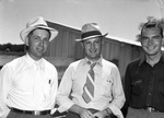 Attending the first annual field day of the Texas Aberdeen-Angus Association at the Gowdy Ranch near Jacksboro, Texas, were, left to right, J. D. Hooten, of Jone Jack Farm, Lee's Summit, Missouri; Tommy Brook, of Camp San Saba, Texas, a registered Angus breeder; and Bill Barton, of Chicago, Illinois, field man of the American Aberdeen Angus Association. The men are standing outside, lined up against a fence. They are all wearing collared shirts and trousers. Hooten and Brook are wearing hats. Brook is wearing a striped necktie.