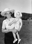 Mrs. Lee O. Gowdy hosted the first annual field day of the Texas Aberdeen-Angus Breeders Association on her ranch near Jacksboro, Texas. She is shown holding her granddaughter, Janice Ray Turner, who is wearing summer outfit and bonnet. Janice is the daughter of Mr. and Mrs. O. R. Turner. Mrs. Gowdy is wearing a blouse, dark trousers, a cowboy hat and eyeglasses.