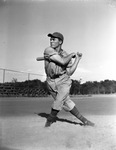 Roy (Tarzan) Wilson, member of the Wolf and Klar baseball team, outfield, shown at bat. He is vying for a spot in the Major City League. He is wearing his baseball uniform and cap.