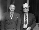 G. M. Heinzelman, left, and John Spears, both of Snyder, Texas, directors of the Permian Basin Oil Association, celebrated the first anniversary of the discovery of oil in the Sharon Ridge pool of Southwestern Scurry County. The men are standing in front of a building. Mr. Heinzelman is wearing a double-breasted suit with a checkered tie. Mr. Spears is wearing a pinstripe suit, a cowboy hat and eyeglasses.