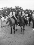 Doctor H. H. Ramsey, left, of Abilene, Texas, and Charles Featherston, of Wichita Falls, Texas, shown as they rode their horses through the parade at the Texas Cowboy Reunion at Stamford, Texas. Both men are wearing long-sleeve, collared shirts, neckties, trousers and cowboy hats. Other participants in the parade are standing in the background.