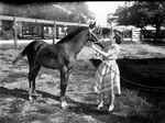 Sue Harding with a colt, gotten this season by Rex Elkins. The colt is out of a Harding broodmare, Edna Hendren, by Red Rex by Red Peavine. Her dam was Minnie Rush by Dare Chestnut by Chester Dare. Sue is seen wearing a stripped dress, as she holds the colt's lead. Published in Fort Worth Star-Telegram morning edition August 11, 1940.