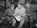 Keeping up with the news from home are these three members of Company B, One Hundred and Eleventh Engineers, on maneuvers with the Thirty-sixth division in western Louisiana. Left to right, are Sergeants Lee Lassiter, Thomas G. Jones and Tyson Roach, all of Bowie, Texas. All three men are seen sitting outside by a tree, reading a newspaper.