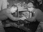 Food for the army must be kept fresh, so these members of Battalion Headquarters, One Hundred and Thirty-first Field Artillery, repair a kitchen refrigeration unit in the field. Left to right, Private Buck Edgar and Sergeant T. M. Newman, both of Abilene, Texas. Both men work under careful supervision.