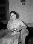 Mrs. L. C. Robinson of Hurst, Texas, is looking through her recipe book for potential Thanksgiving dishes. She makes a roast turkey and dressing that is famous in the community. She is sitting on a chair, wearing a button-up dress.