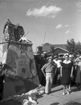 Dalhart. XIT Reunion. Bobby Dyckes, Dalhart cowboy artist, and Mrs. John Marsh, Miles City, Montana, seen standing outside beside a monument.