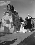 Dalhart. XIT Reunion. Mrs. John Marsh standing beside the monument, wearing heels, a dress, and bow tie on her head.