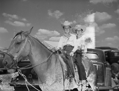 The twelfth annual Throckmorton County Fair and Rodeo is opening Thursday morning. Riding double on a horse for the parade are Mary Gene Forman and Hartal Falls. They are among the cowgirls participating in the opening day parade. They are both dressed in western gear, from the cowboy hats down to the cowboy boots. Mary Gene is the daughter of Mr. and Mrs. Fred Forman. Hartal is the daughter of Mr. and Mrs. Talmage Falls. There are several automobiles parked in the background.