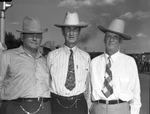 Dalhart. XIT Reunion. Left to right, Arch Sneed, Dalhart, Will Matthews, Goldsboro; and W. R. Tisdale of Coleman, seen standing side by side each other outside wearing button down shirts and a hat.