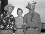 XIT Reunion. Dalhart. Left to right, Mr. and Mrs. Pem Denton of Amarillo, Texas and George Burnett of Dumas. They are all seen linked arm in arm standing against a wall.