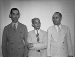 Associated Master Barbers' state convention attendees include (eft to right) J. D. Upchurch, Houston, Texas; Bert Young, Houston, Texas, and Otto Oberle, Fort Worth, Texas. Each man is seen sitting side by side by side each other wearing suits and a tie.