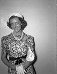 June Gaudin of Los Angeles, California, has been honored in a series of formal parties during her visit. She is seen wearing a hat, dress, gloves, and is holding a purse under her arms.