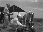 Pitchfork Ranch in Dickens and King counties. Floyd Adams, Lassiter Hensley and "Peel" Leonard, all at the chuck wagon.