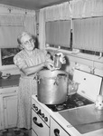 Mrs. George Degenhart learned how to can food when she moved to the country, near Euless, twenty years earlier. Unsure at first, she found the canning work to be surprisingly easy. She is demonstrating the process in her kitchen. A large pot is on the stove and Mrs. Degenhart is holding a jar of beans. She is wearing a patterned dress.