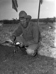 Pitchfork Ranch in Dickens and King counties. Seen is a rancher bent down on the ground eating a plate of food.
