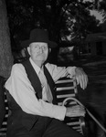 Wise County Old Settlers Reunion. Cal Newton, 93, seen sitting outside on a bench holding a cane.