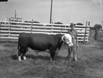 Cooke County Fair, Gainesville. Champion Hereford Bull owned by R. B. George Ranch and held by Grandville O'Brien.