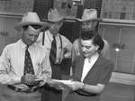 Colorado City Rodeo. Publicity committee for Colorado City rodeo. Left to right, Ben Smith, W. W. Whipkey, Jewel Barrett and A. E. McClain, seen standing around reading a paper.